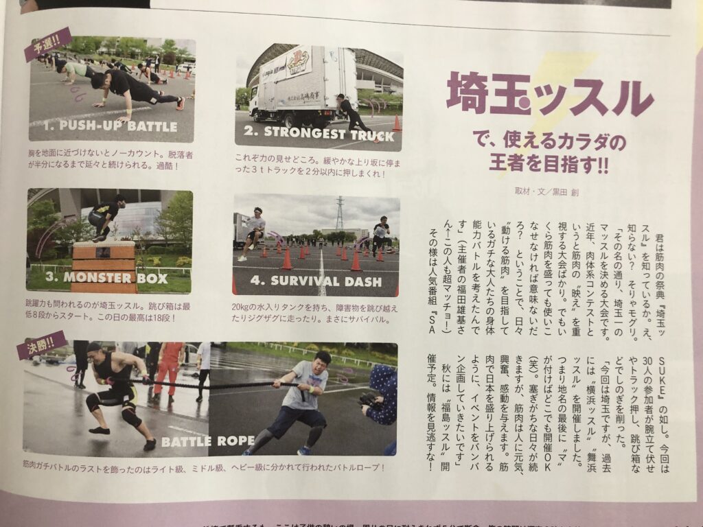 2021年4月17日 第3回「埼玉ッスル」選手権①モンスターボックス②プッシュアップサバイバル③ストロンゲストラック(トラック押し)④サバイバルダッシュ決勝トーナメント:バトルロープ予選通過者にて決勝トーナメントを実施今大会から体重別に3つのカテゴリーを設ける。